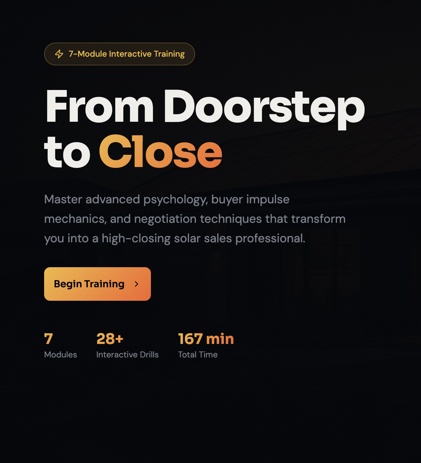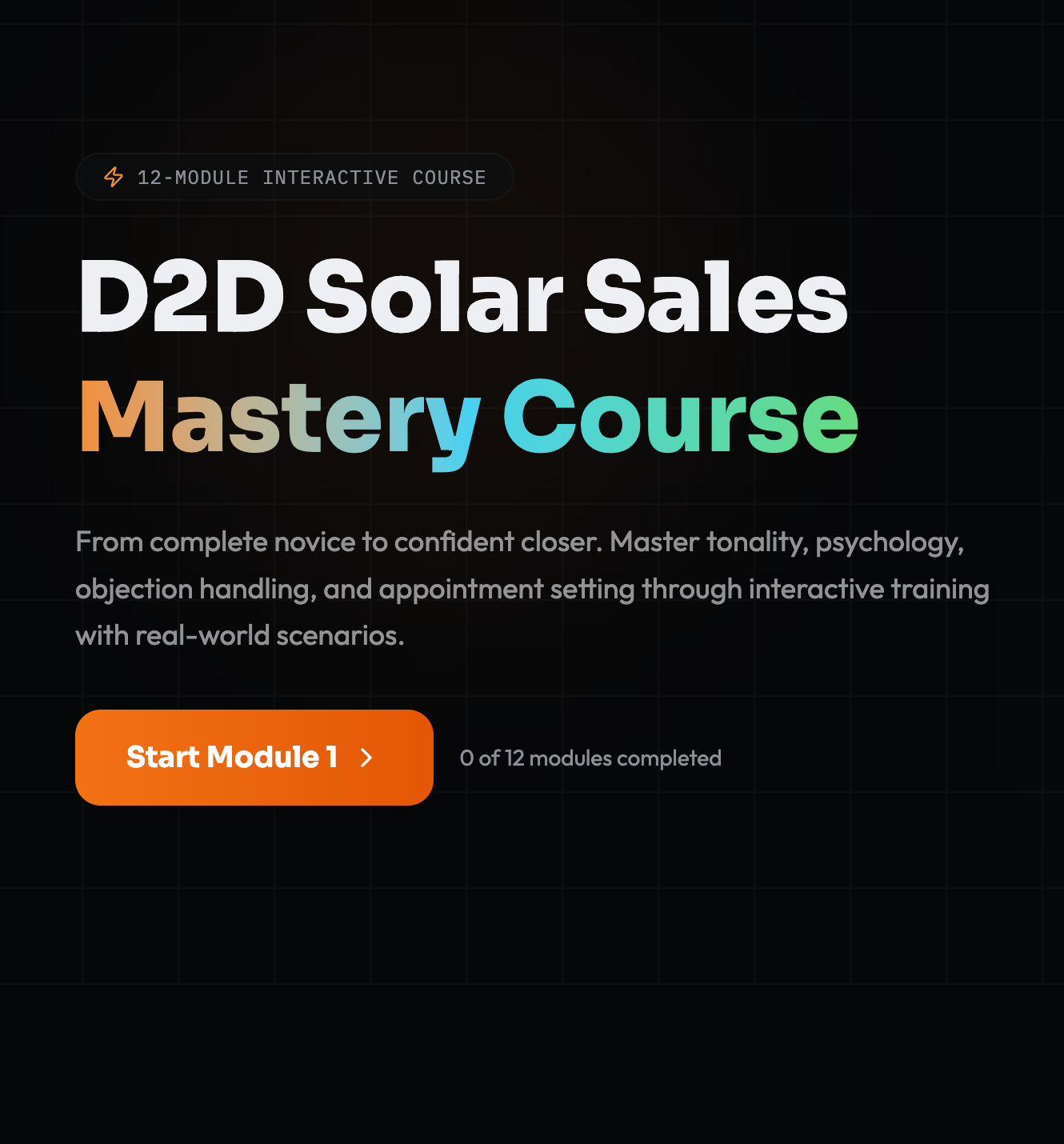 Industry Leading Pay ✳︎ Top Tier Training ✳︎ Industry Leading Pay ✳︎ Top Tier Training ✳︎ Industry Leading Pay ✳︎ Top Tier Training ✳︎ D2D SALES MASTERY COURSE Begin your journey Solar SALES Closer COURSE Learn your craft SALES COMMISSION PORTAL Check your earnings